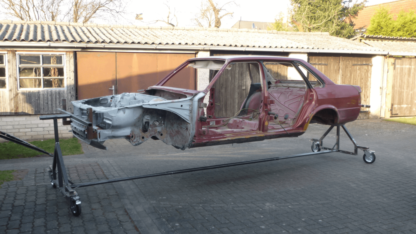 So kaufte ich eine Audi 80 Limousine (nächstes Bild) für nur 150€ als Ersatzteilspender mit einem ganzen Transporter voll mit Teilen. Sie war vom Vorbesitzer komplett zerlegt und stand nur noch auf der Hinterachse.